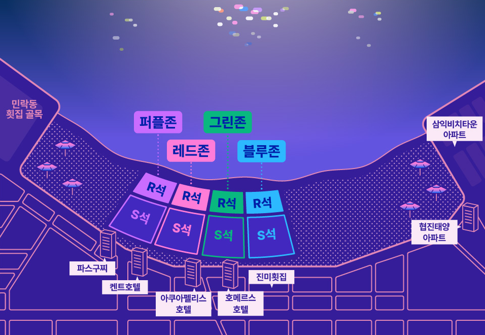 2024 부산불꽃축제에서는 관람객들이 보다 편안하고 안전하게 축제를 즐길 수 있도록 다양한 좌석 옵션이 마련됩니다. 좌석 배치도는 행사장 내에서의 위치와 좌석 종류에 따라 구분되며, 주요 구역은 다음과 같습니다.