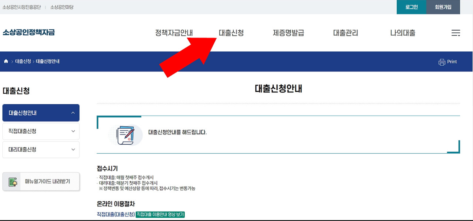 ◼ 로그인한 후, '대출신청' 메뉴를 클릭하여 대출 신청 절차를 시작합니다.